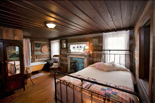 The Iris bedroom is located just off the kitchen. It has its' own private bath with a claw-foot tub right in the room. Two lovely stained glass windows impart a warm glow to the room all day long.